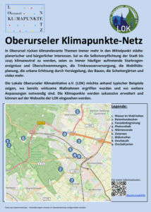 Getan haben die zahlreichen Beteiligten tatsächlich viel: Themen wurden ausgewählt, Standorte bestimmt, Texte erarbeitet, Webseiten entwickelt (Online erreichbar unter https://l-o-k.org/kpn/), Schilder in Auftrag gegeben und schließlich montiert. Insbesondere Rüdiger Reul, der die Tafeln drucken ließ und sich auch bei der Montage tatkräftig einbrachte, trug maßgeblich dazu bei, dass das Klimapunktenetz noch pünktlich zum Herbsttreiben bei schönstem Spätsommerwetter eröffnet werden konnte.